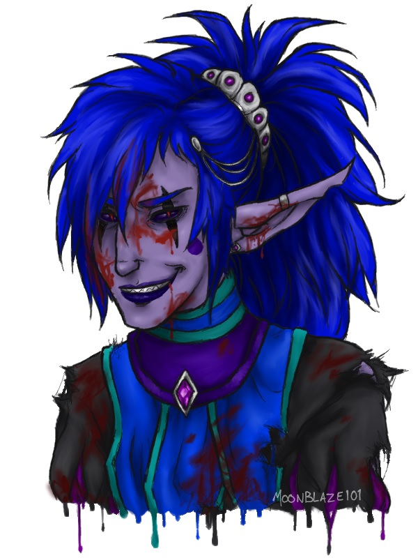 — ¿Crees en los cuentos de hadas ahora, cariño?El bufón de pelo azul jadeó mirando a Alexa través de un ojo, ya que la mitad de su rostro había sido quemado. Él sólo podía sonreír se balanceaba hacia atrás y adelante, y caminaba hacia Alexa arañando las paredes, empujándolas contra él. Se acercó al oído de Alexa y le susurró profundamente con voz gutural.